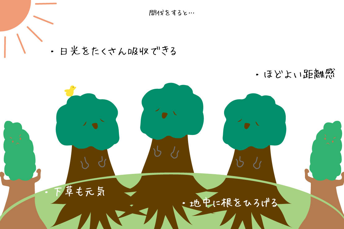 間伐をすれば、日光をたっぷり浴びることができるので、地中にも元気に根を張り巡らすことができます。