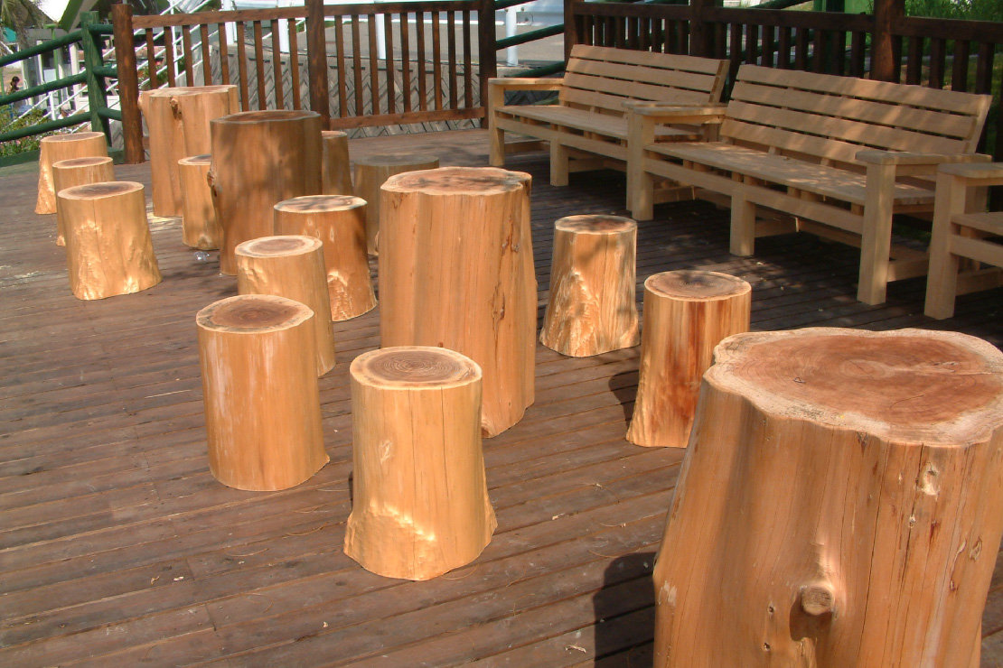 園庭で活躍するテーブルとベンチのセットです。ピクニックや砂遊びなどに重宝するでしょう。大人が座っても十分な強度です。持ち運びできるので、運動会など広いスペースが必要なときは片付けることができます。丸太を使用した木感あふれるデザインもあります。公共施設での設置、固定も承ります。