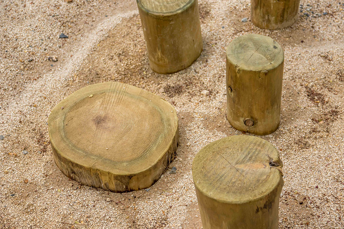 跳んで、またいで、座って、いろんな楽しみ方ができる跳び丸太は遊びを生み出す力も身に付きます。丸太から1本1本切り出して製作しています。すべてのカドを丸く取ってあるので、子どもが触れても安心です。設置スペースの大きさに合わせてサイズを設計いたします。